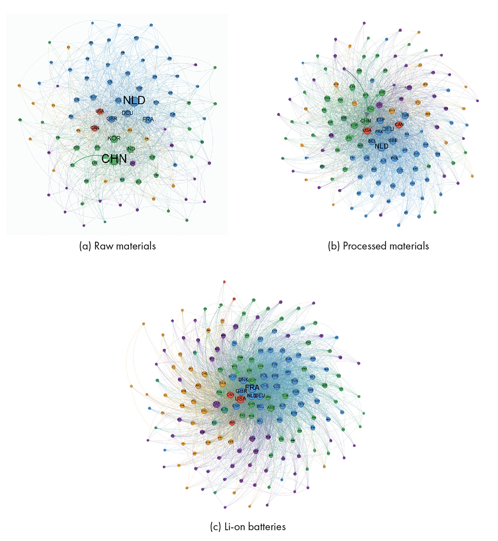 Specifically, we map the supply chain into three layers: raw minerals, processed materials, and finished lithium-ion batteries. Figure 1 shows a graphical representation of these networks for 2022,highlighting the main actors at each stage.