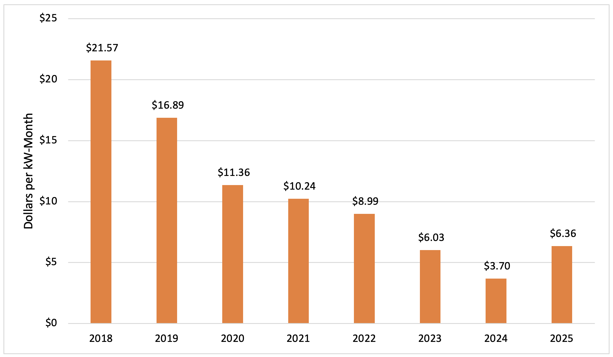 Capacity costs are non-trivial for CMLP. Its annual payments in 2022 came to over $3.3 million a year. Reducing CMLP’s peak can bring about substantial savings. The value of reducing CMLP’s coincident peak per kilowatt in 2022, for example, was $8.993. On a megawatt basis, this is $8,993 per month or $107,921 annually. Figure 1 shows the value to the local municipal utility of reducing demand at the system peak by 1 kilowatt in each of the past 8 years. The expected savings have declined over time but are beginning to rise again and are anticipated to rise further, given ISO-NE’s projections of rising clearing prices in the forward capacity auction over the next few years.