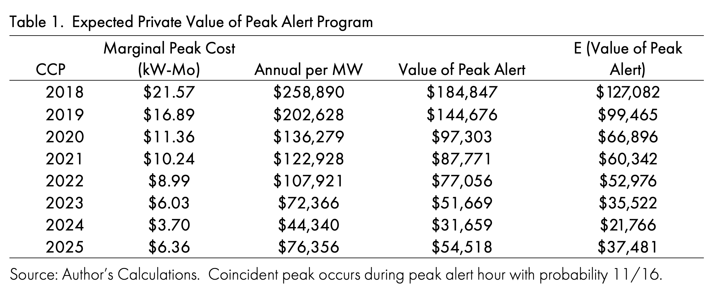 The private benefits to CMLP from this program are substantial but come at the cost of shifting capacity costs on to other LSEs in ISO-NE. There are social benefits from the program, however. But I find that those social benefits are swamped by the private benefits. These private benefits arise, however, by shifting capacity costs onto other utilities and load customers in the region. This, of course, suggests an unproductive competition where ISO-NE LSE’s implement similar programs to reduce peak demand during the hour that ISO-NE is predicted to hit its annual peak. A focus on reducing this singular hour of demand is unlikely to reduce overall peak demand and the need to have capacity available for high-demand summer hours. Such a competition would suggest that it would be fruitful for ISO-NE to consider alternative ways to allocate capacity charges across its customers that don’t focus on a single peak hour of the year to allocate annual charges.