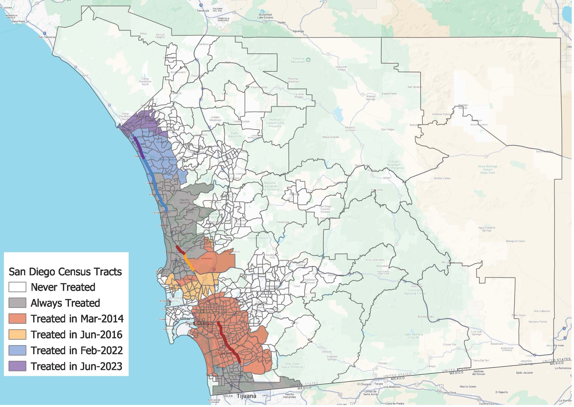 Notes: This figure illustrates how we define the treatment of census tracts based on the addition of new HOV lane segments within 5 miles of the population centroid of a tract. The map shows all census tracts in San Diego County, color-coded according to their treatment status. Census tracts that are not colored were never treated because no operational HOV lanes were within 5 miles of their population centroid at any time between 2012 and 2024. Grey tracts are always treated, as operational HOV lanes were already within 5 miles of their centroids before the start of the observation period in 2012. Red tracts gained access to an HOV lane within 5 miles of their population centroid when new HOV segments were added to the HOV lane network in March 2014. Similarly, yellow tracts were treated following HOV lane additions in June 2016, blue tracts in February 2022, and purple tracts in June 2023. The map also includes the HOV lanes added to the road network during the sample period, color-coded to match the treatment of tracts. For example, red lane segments represent those that became operational in March 2014.