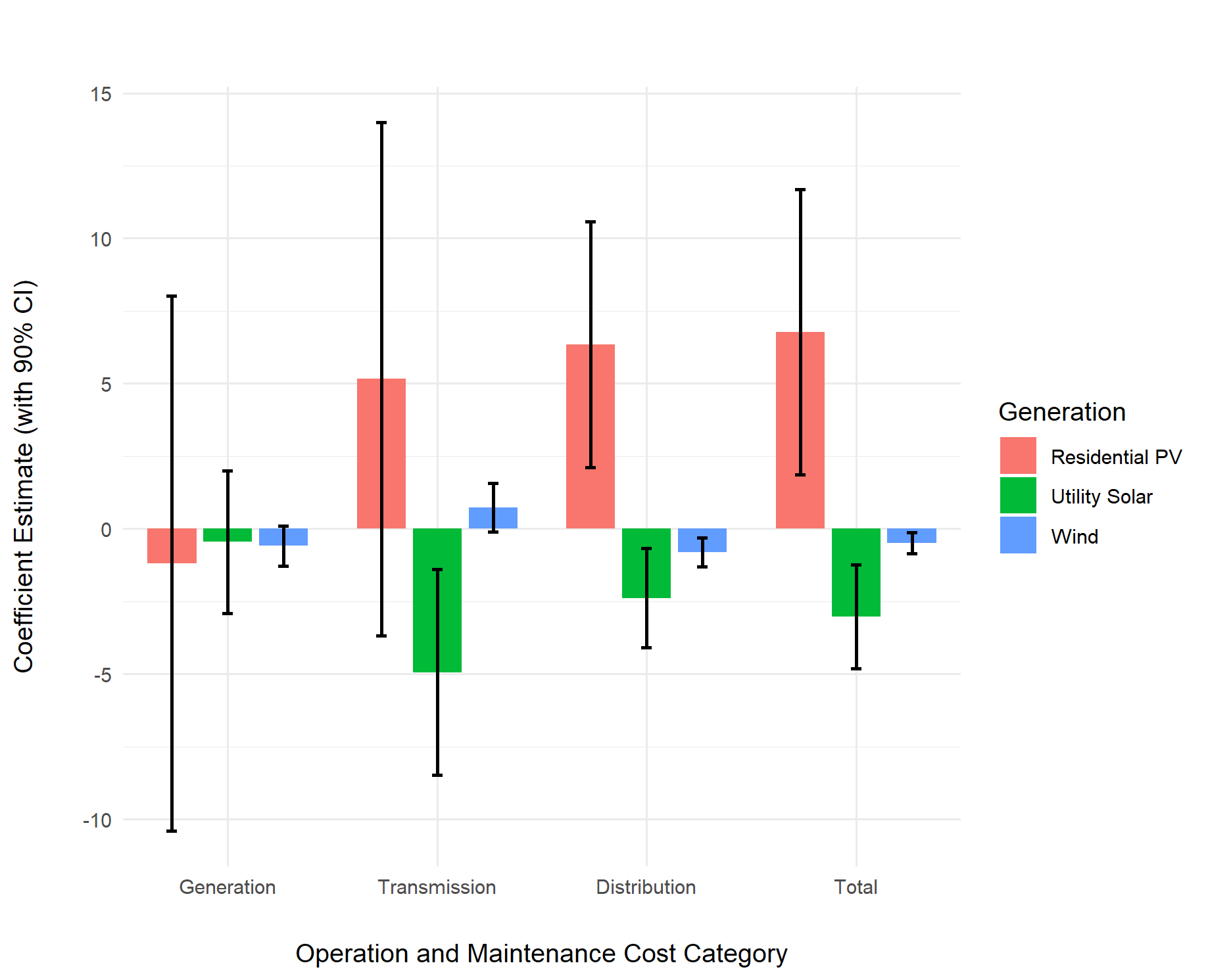 This coefficient plot displays three separate fixed-effects regression models that compare the impacts of different generation technologies on self-reported utility spending on generation, transmission, and distribution O&M costs. Residential PV (or solar) generation is consistently correlated with higher distribution and total costs for utilities whereas utility-scale solar and wind are associated with delivery and total costs.